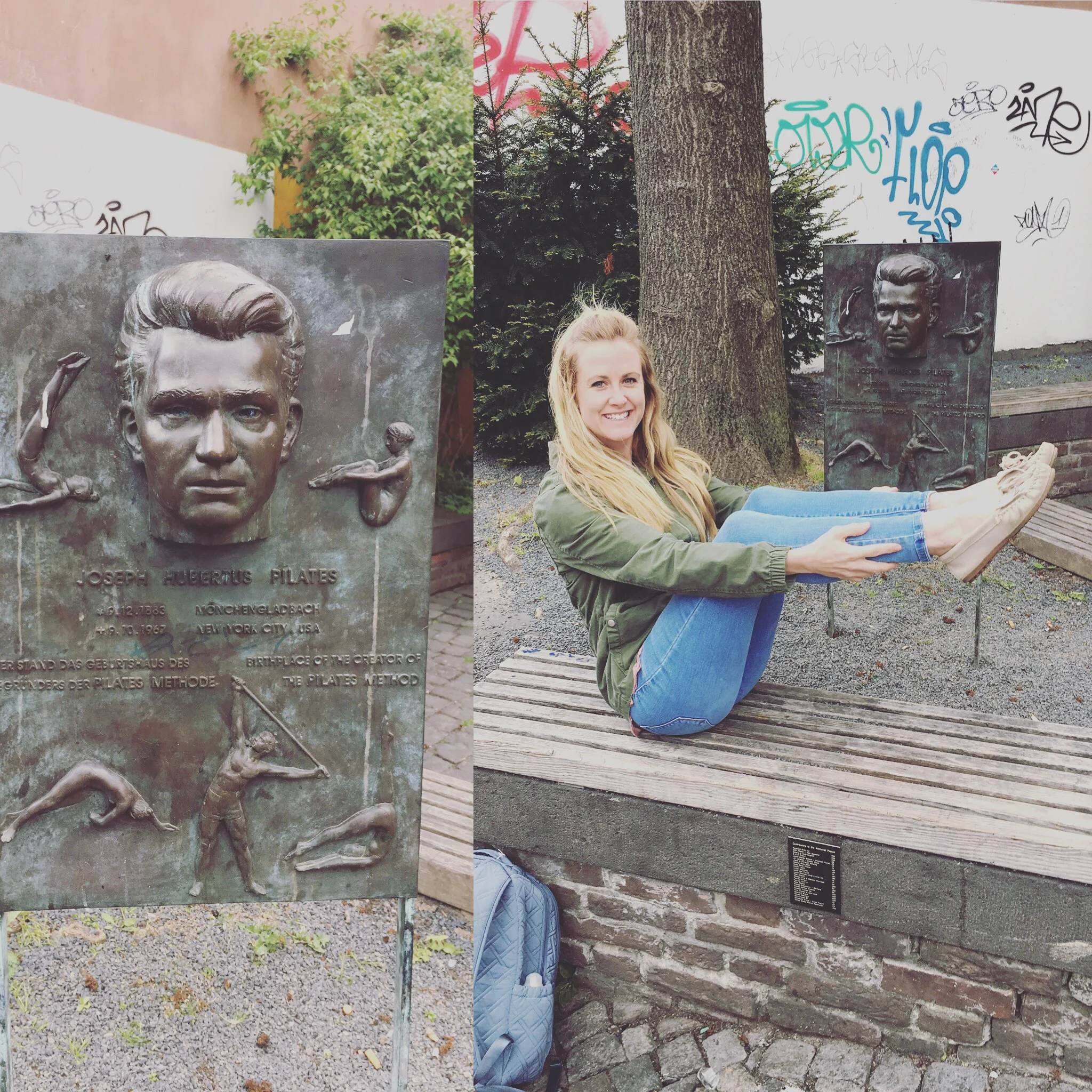 Katie in front of the joseph pilates plaque in Mönchengladbach, Germany. Joseph pilates home was located here and now a plaque and bench are here for his many followers to find.